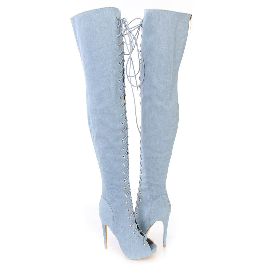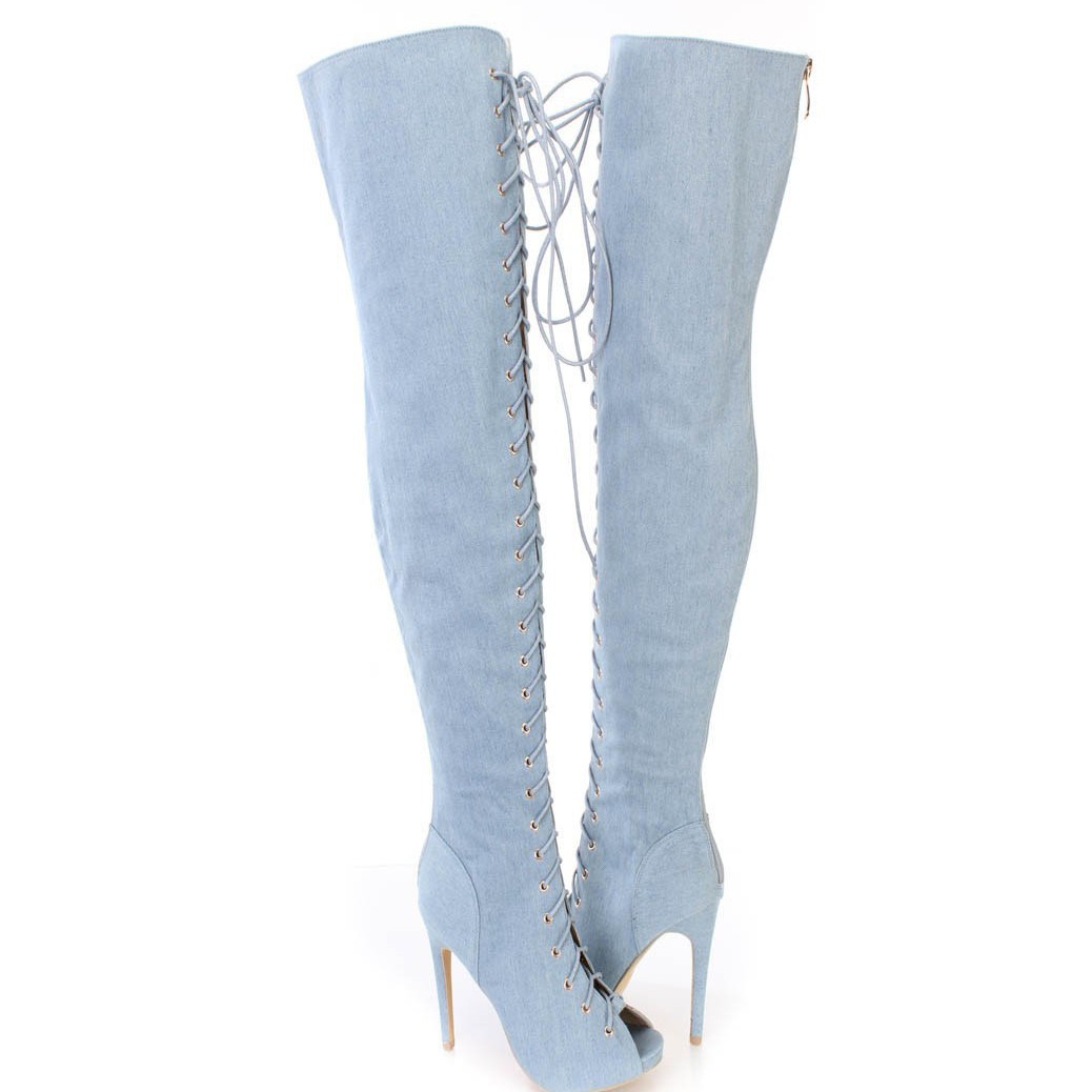 Women's denim boots peep toe high heel over the knee boots