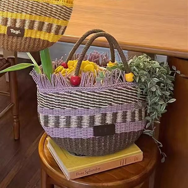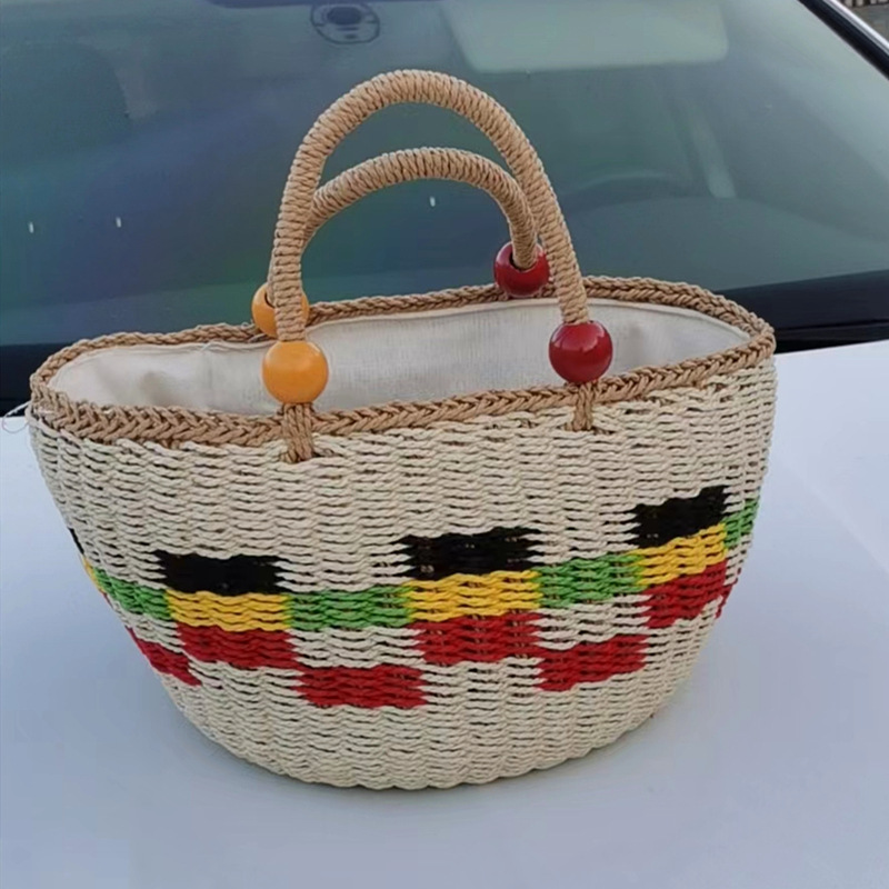 New style bucket bag gift picnic tassel wood beads decoration cute handmade woven straw bag #H336