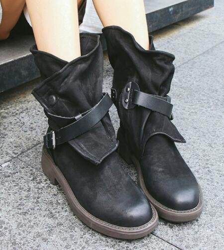 Round toe ankle strap low square heel boots for women