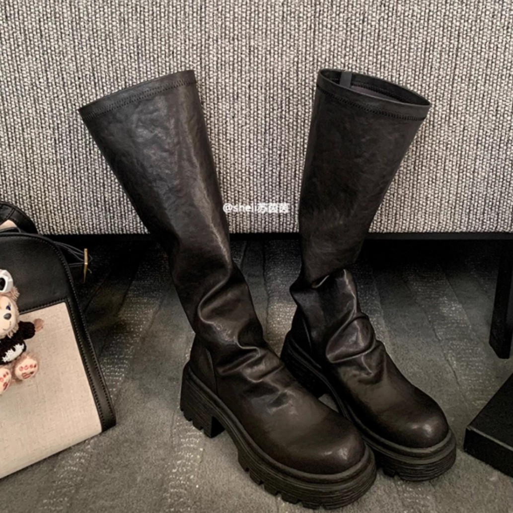Genuine leather thick heel pleated mid-high elastic pile women's knight boots