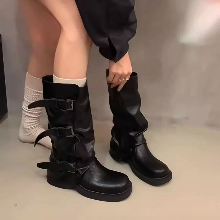 Cowhide belt buckle pile boots new style distressed pleated mid-calf boots