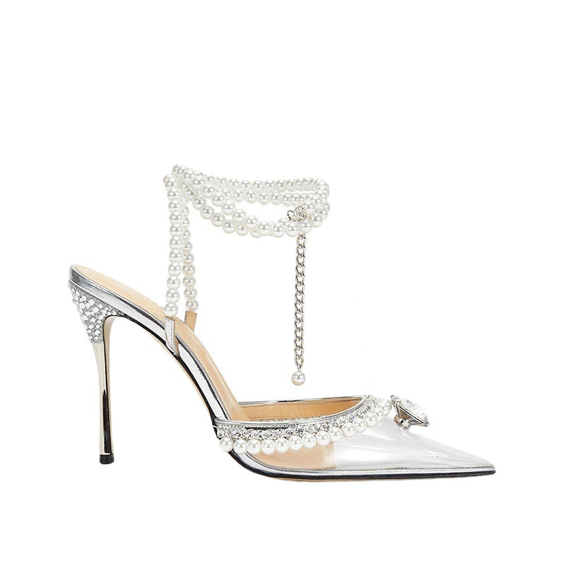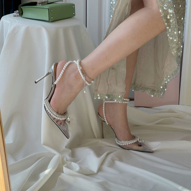 New pearl high heels pointed toe stiletto pvc rhinestone toe strap sandals women