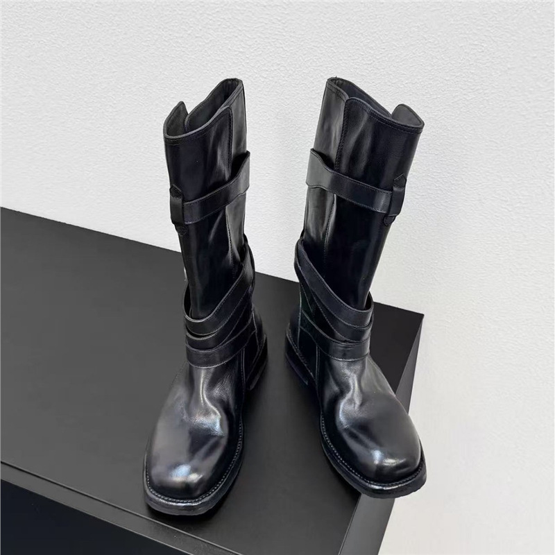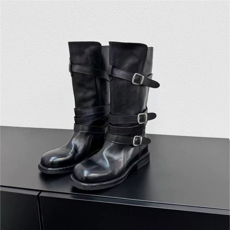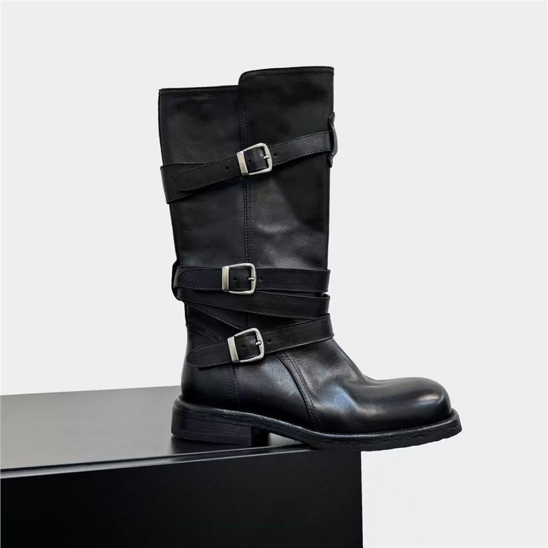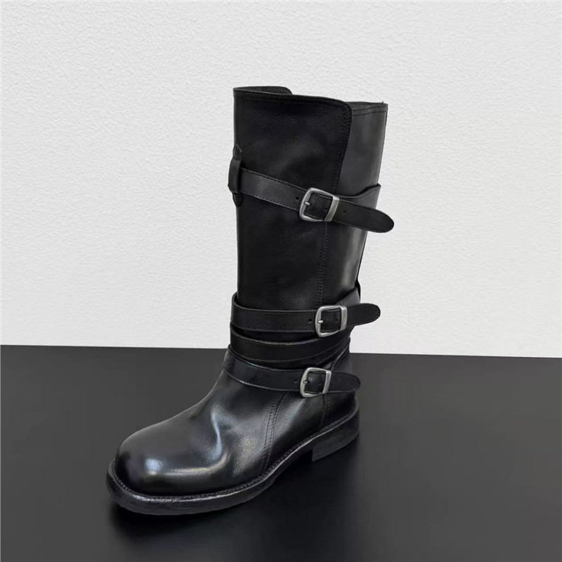Round-toe dark-style fashion boots with wrap-around belt buckle
