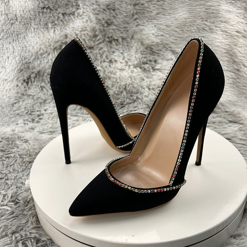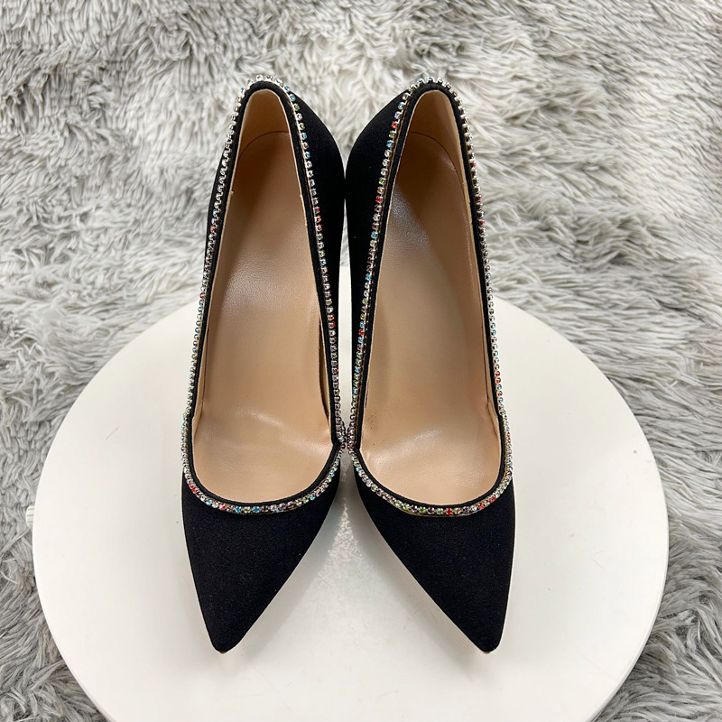 Black suede 12cm pointed toe stiletto diamond chain high heels