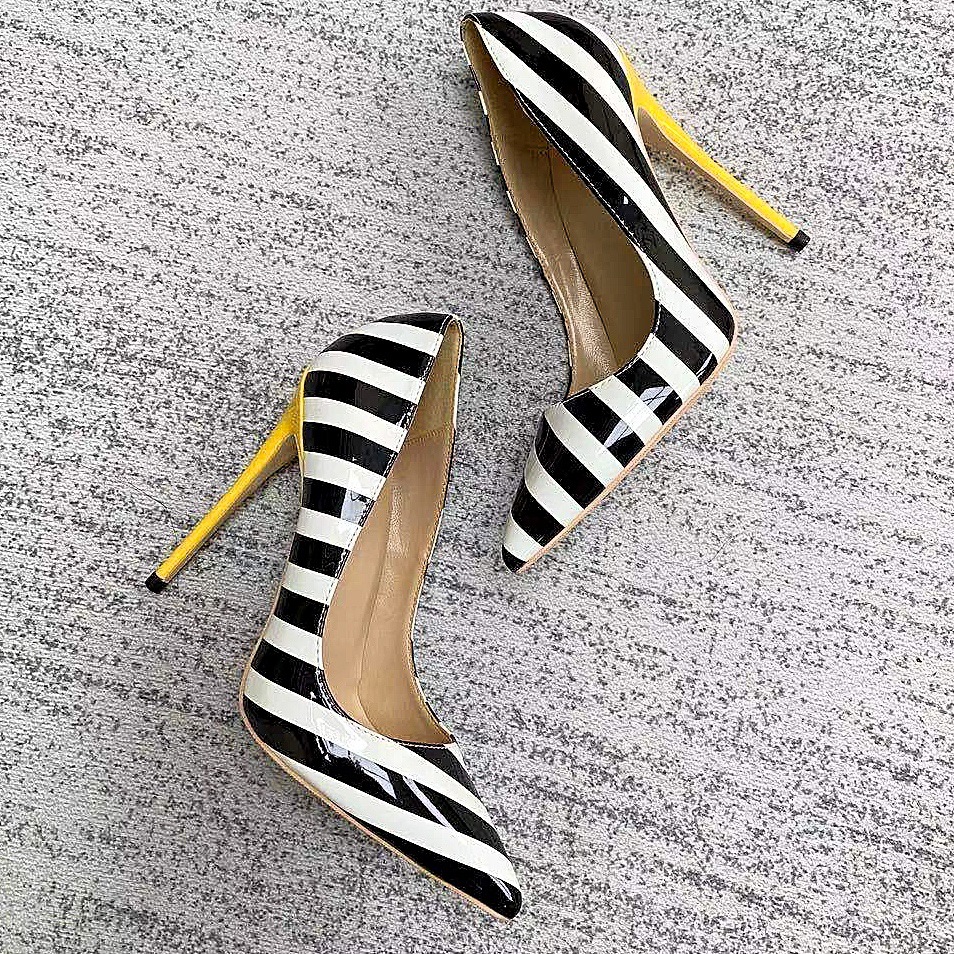 Black and white striped women's color matching stiletto high heels