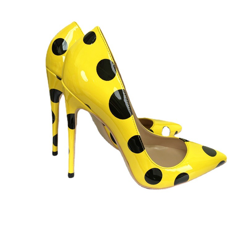 Shiny stiletto heels pointed toe yellow polka dot party shoes