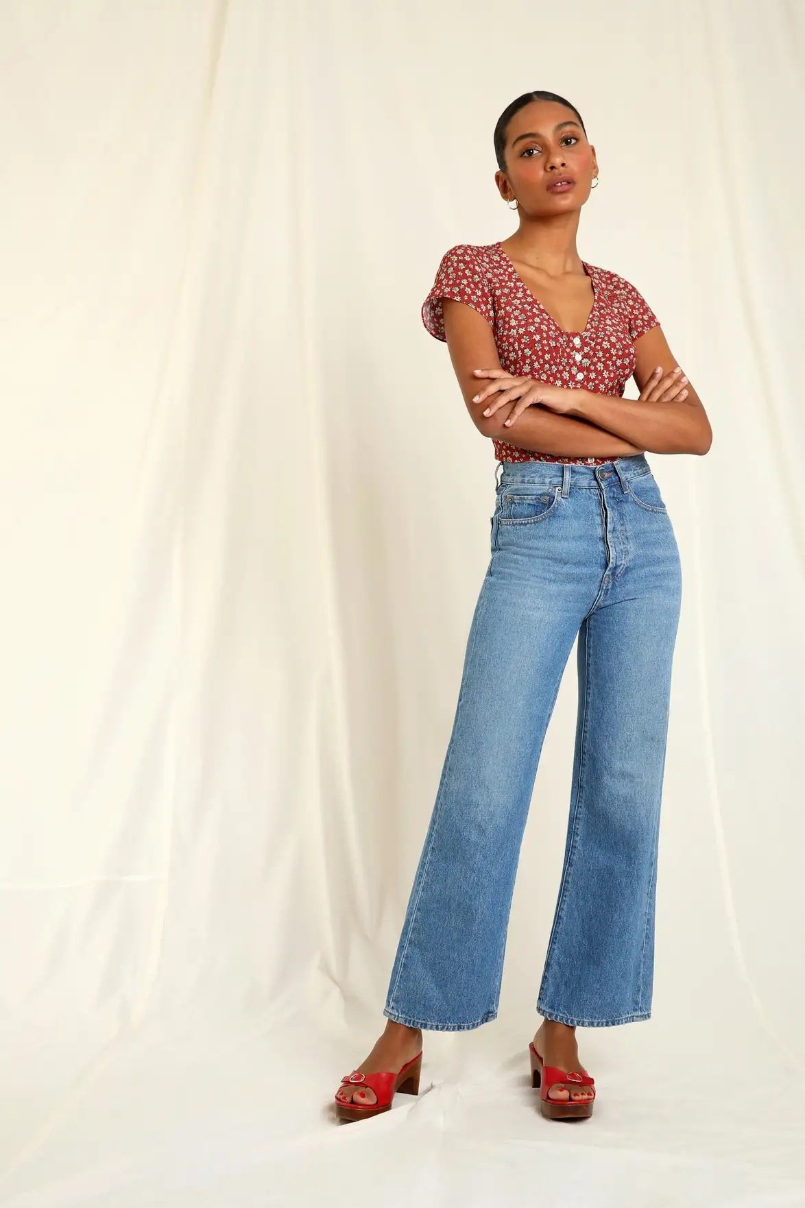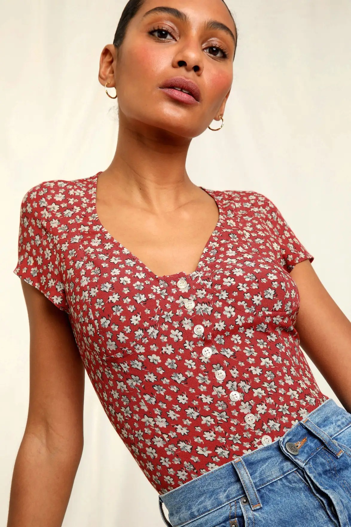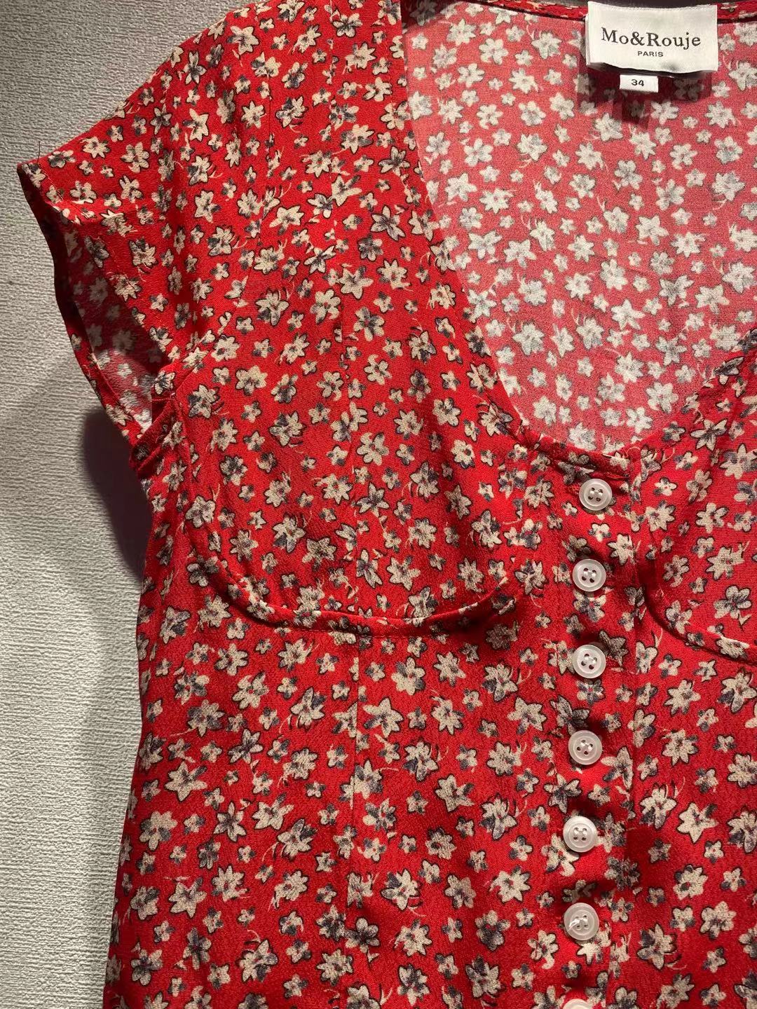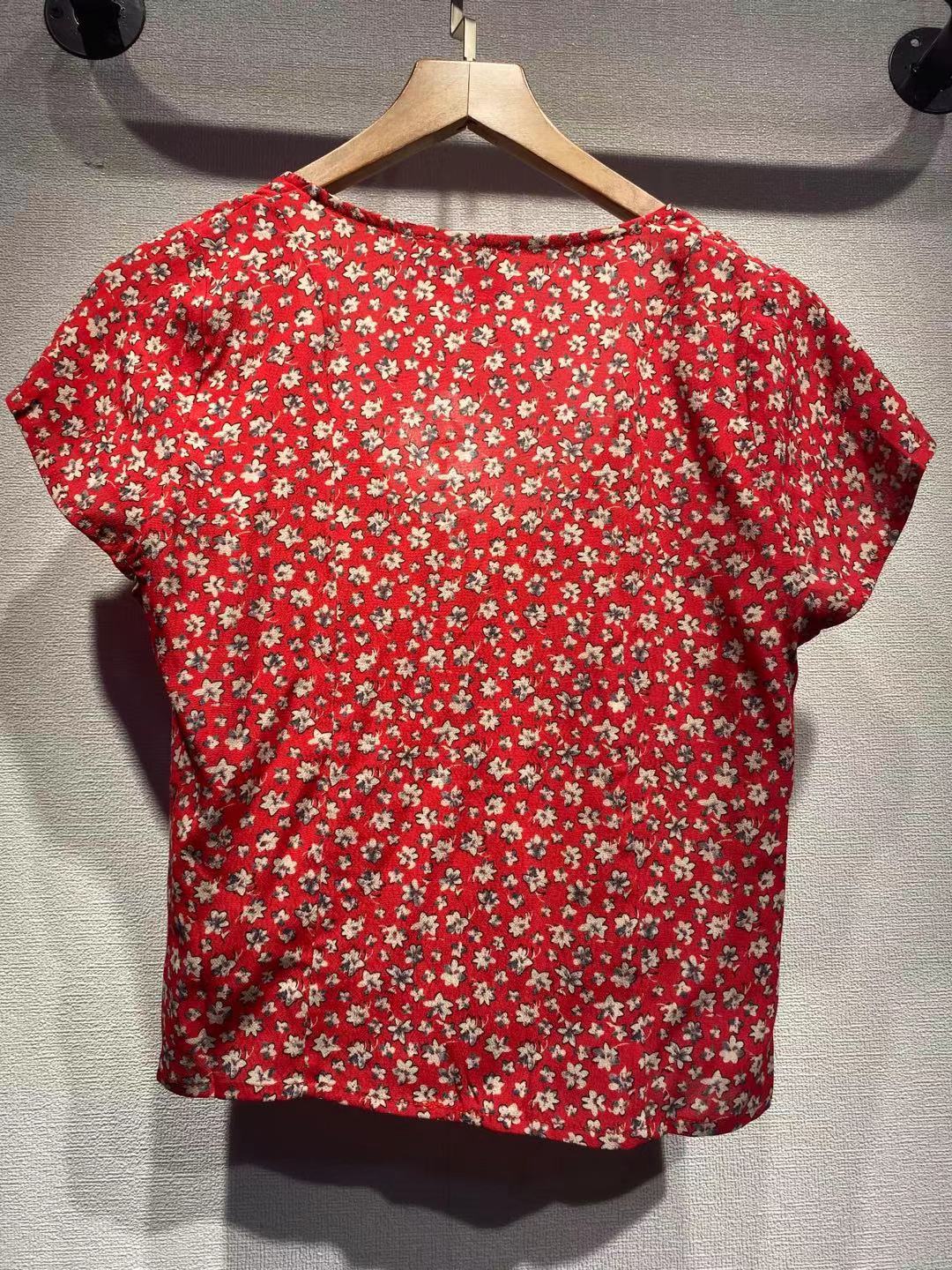 French pastoral style silk printed V-neck button-down short-sleeved top for women