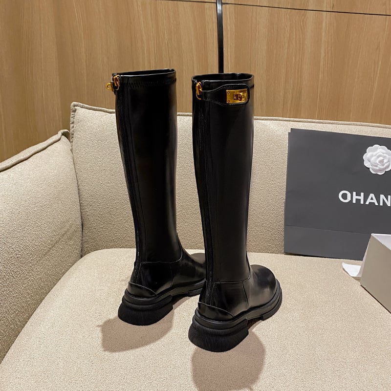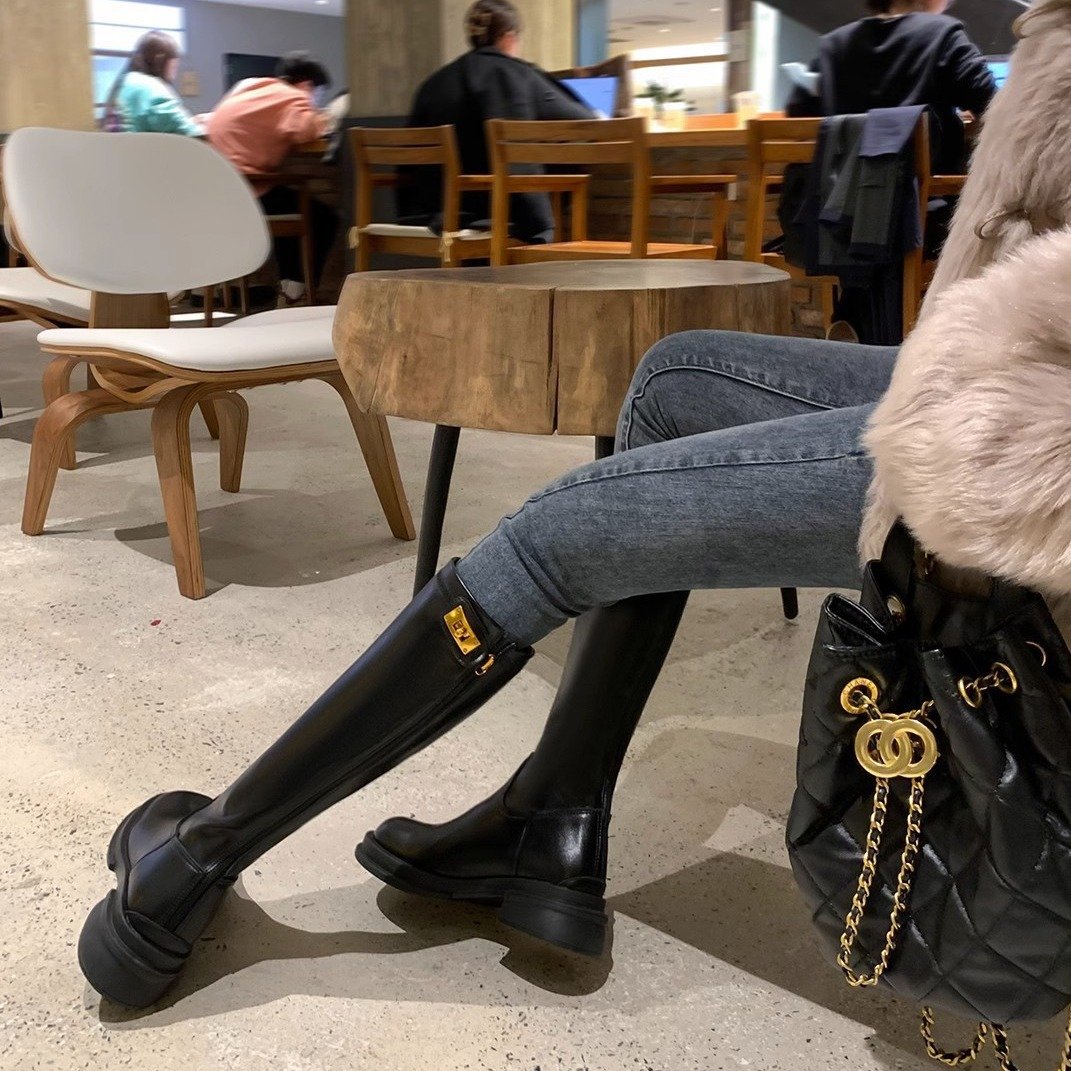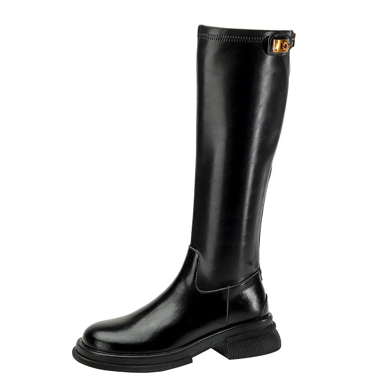 Women's genuine leather thick-soled gold buckle high boots retro knight boots