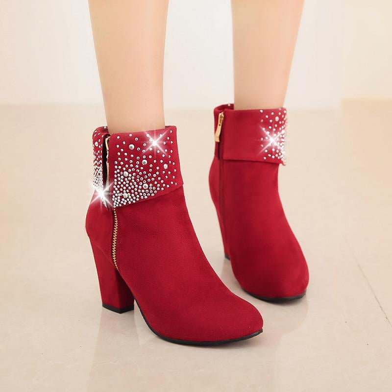 Large size high heel thick heel rhinestone short boots women's wedding boots 3 colors